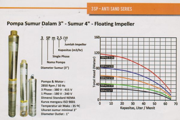 | Fitur | Pompa & motor dapat di pisah, mampu di lalui air dengan kandungan pasir 1% Mampu Start – Stop 30 kali dalam 1 jam Dilengkapi thermal overload motor, desain screen dan anti sand yang optomal sehingga impeller tidak mudah tersumbat |